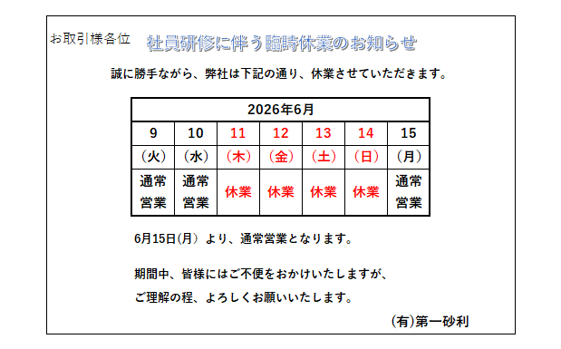 2026年6月11日~14日 社員研修に伴う臨時休業のお知らせ 2026.04.10 Post Share LINE note この記事のタイトルとURLをコピーする 2026年ゴールデンウィーク休業のお知らせ 前の記事